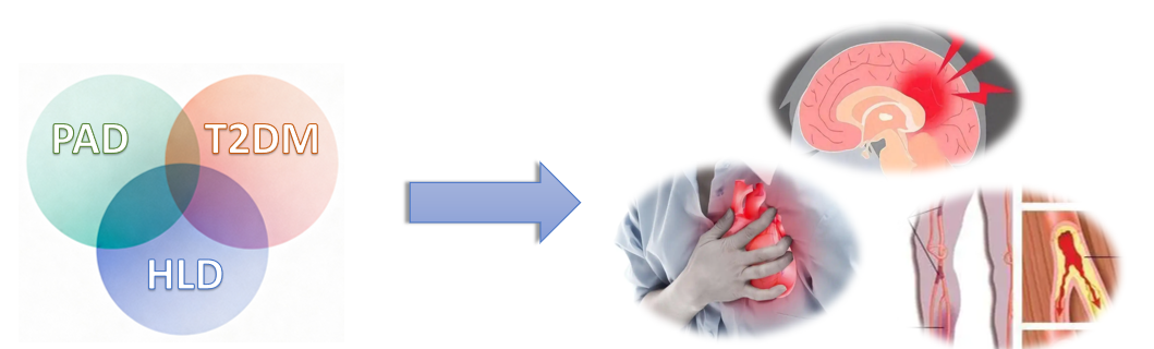 图1. PAD与2型糖尿病、高脂血症的共病关系及其导致的心、脑、肢体器官损害