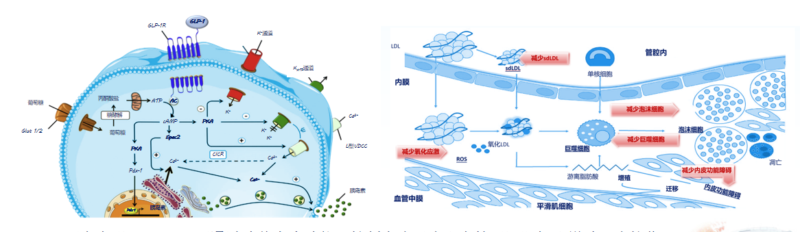 GLP-1RA通过模拟肠道激素GLP-1的生理作用,促进胰岛素分泌,还可通过改善内皮功能、抑制炎症反应和血管平滑肌细胞增殖,直接作用于动脉粥样硬化斑块的形成与发展环节(图2)[6]。