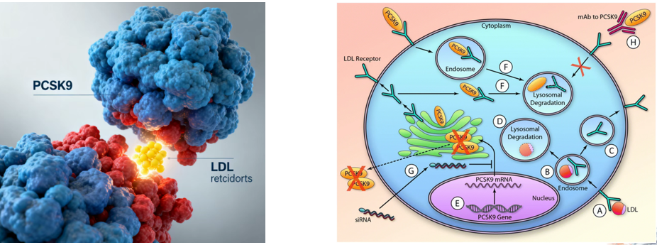 PCSK9通过结合低密度脂蛋白受体(LDLR)并促进其降解,削弱肝细胞清除低密度脂蛋白胆固醇(LDL-C)的能力。该抑制剂(PCSK9i)通过特异性结合PCSK9,阻断该过程,促进LDLR的循环利用,从而显著降低血浆中LDL-C水平(图4)。