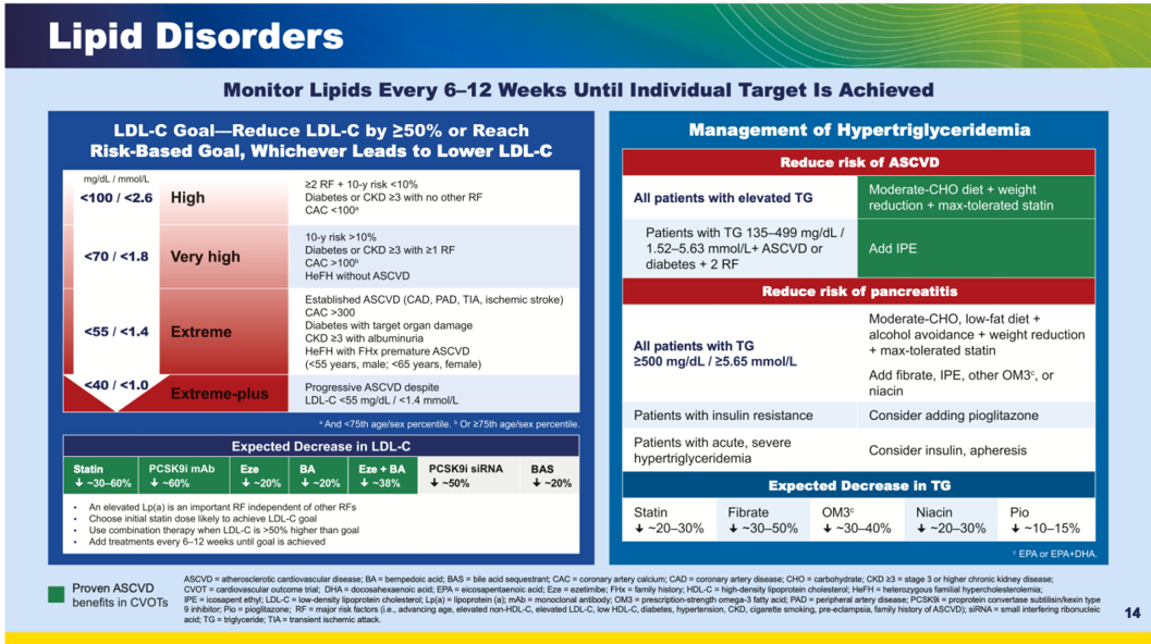 总之,目前国内外各大血脂管理指南均将糖尿病患者列为心血管高危及以上人群,推荐强化降脂方案。2024年发布的《糖尿病、心肾和代谢疾病管理的多学科实践建议》进一步构建了涵盖风险评估、目标设定、药物选择和长期随访的完整管理路径,标志着糖尿病心血管风险管理进入精准化、全程化的新阶段。