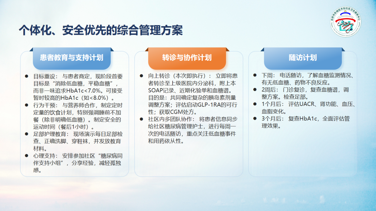 专业照护:由糖尿病管理护士进行每周一次的电话随访,核心是监测低血糖事件与用药安全,形成稳定的支持纽带。