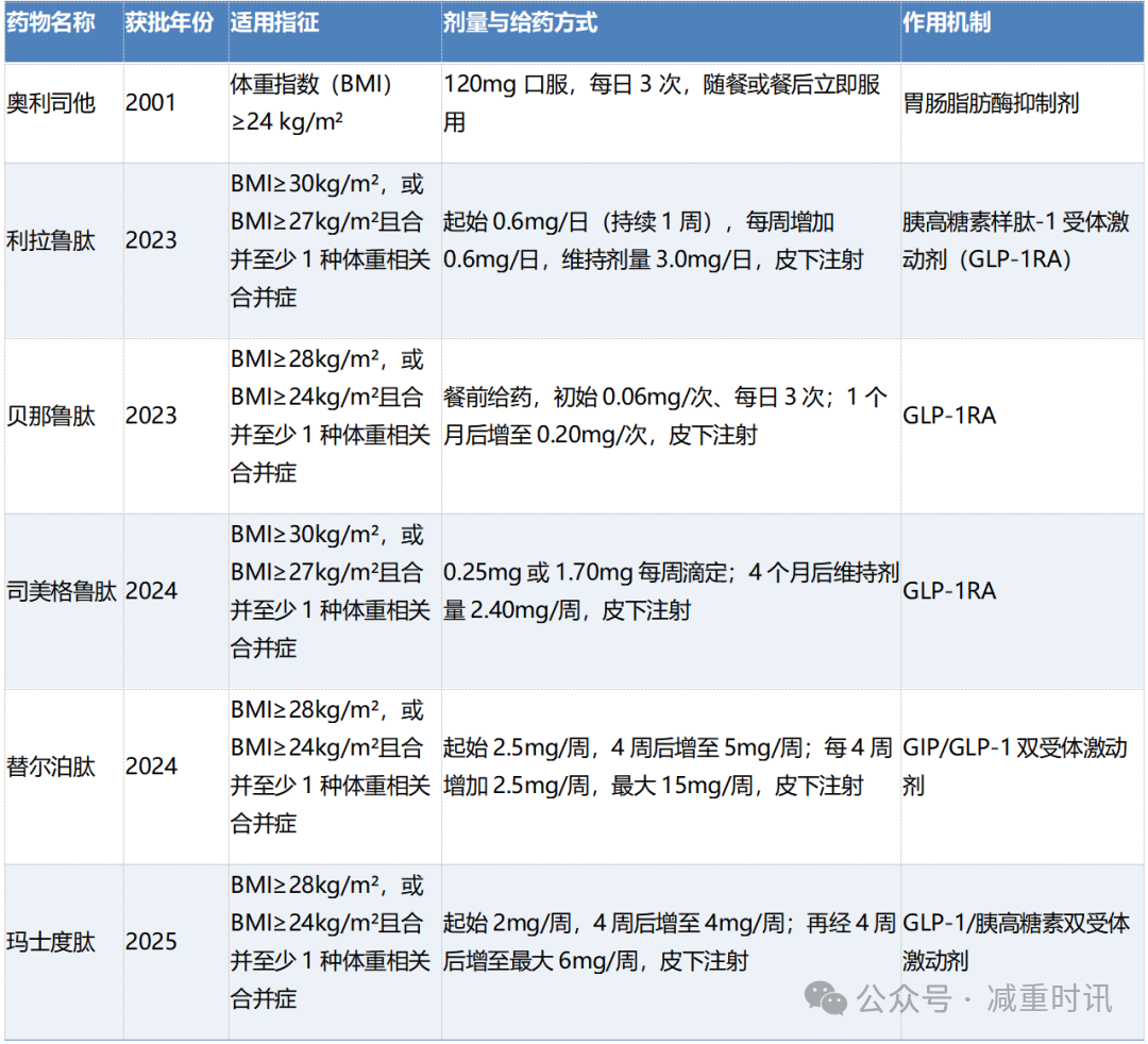 表1. 已在中国获批的减重药物的关键信息