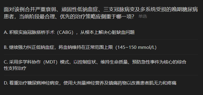 选项C(MDT支持治疗)为当前阶段最合理、最人道的核心策略。 患者已进入衰弱终末期,存在不可逆的多器官功能受损,治疗目标应从积极治愈转向以多学科协作为基础的综合性支持与安宁疗护。这一策略的核心在于症状控制(如缓解神经痛、呼吸困难等)、维持生命质量(通过个体化营养支持、专业护理预防感染与压疮等)、预防急性事件(密切监测并缓和处理心衰、感染及电解质紊乱)以及提供心理与社会支持(缓解患者与家属的痛苦与焦虑)。该方案正视疾病不可逆转的现实,将医疗重心从疾病本身的根治,转向以患者整体舒适、功能维持与尊严保护为核心的全面照护,符合晚期复杂慢性病管理的伦理与实践原则。