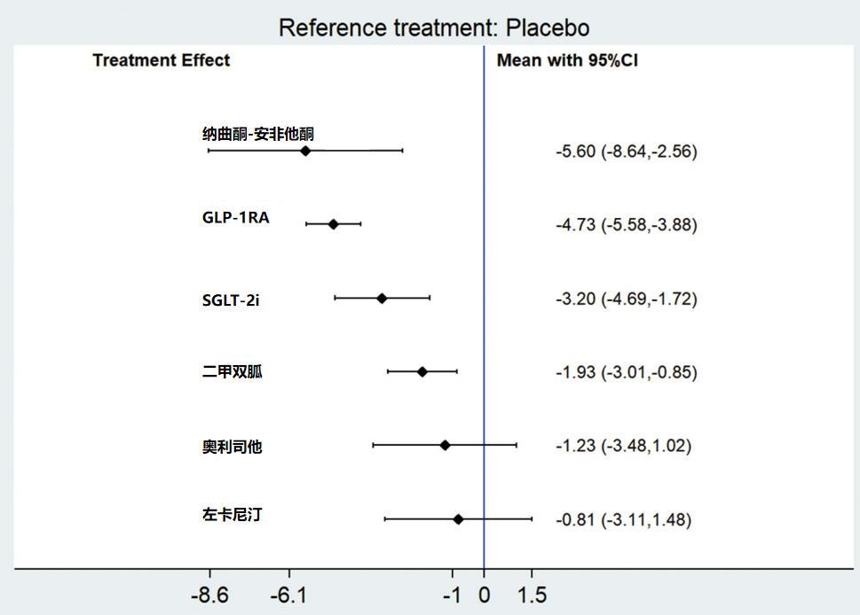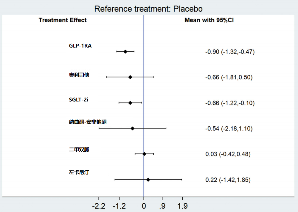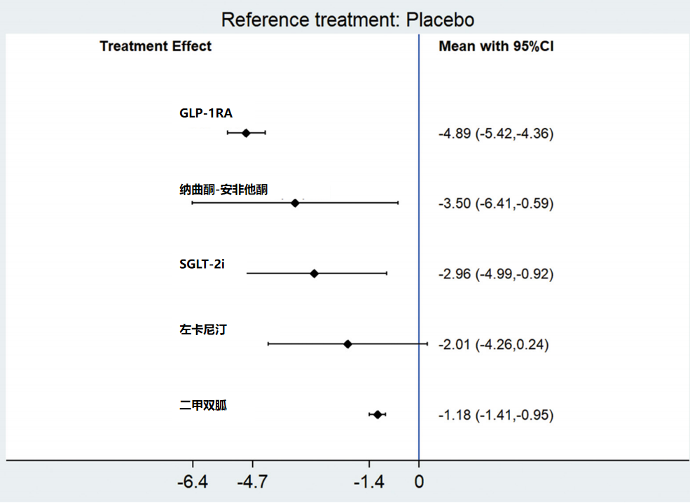 在纳入26项报告腰围的研究(共涉及1860例患者)的荟萃分析中,GLP-1RA腰围减少最明显,平均为-4.89 cm,且效应量稳定(95%CI:-5.42~-4.36),二甲双胍平均为-1.18 cm(图4)。