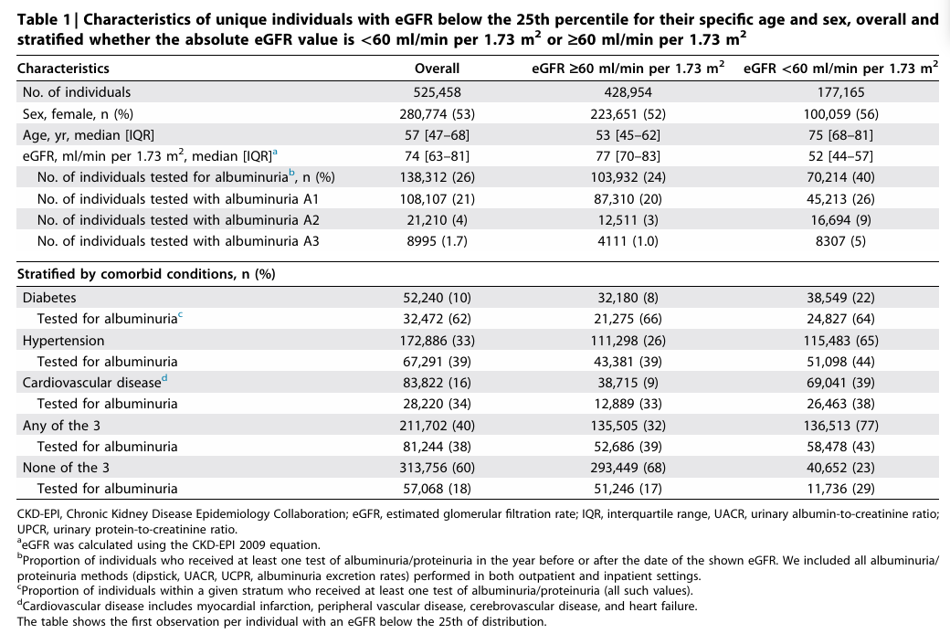 白蛋白尿检测率总体偏低,在高危人群中检测频率稍高。具体数据显示:eGFR≥60 ml/(min·1.73m2)者中24%在eGFR检测前后1年内接受白蛋白尿检测,eGFR<60 ml/(min·1.73m2)者中该比例为39%。在合并糖尿病、高血压或心血管疾病(CVD)的个体中,白蛋白尿检测率较高且在eGFR高低亚组差异较小——糖尿病患者66% vs. 64%,高血压患者39% vs. 44%,心血管疾病患者33% vs. 38%。而无这些合并症的个体检测率较低,且eGFR组间差异更明显:eGFR≥60 ml/(min·1.73m2)组为17%,eGFR<60 ml/(min·1.73m2)组为28%。