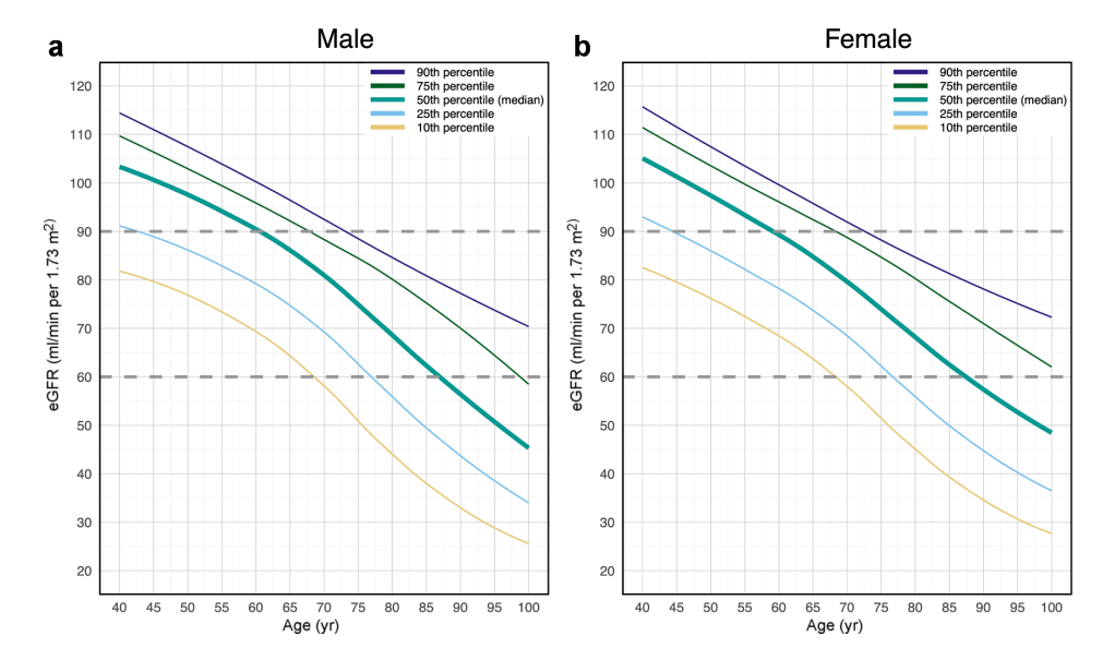 慢性肾脏病(CKD)的早期识别和一级预防策略仍有待完善。尽管eGFR的自动报告已成为常规,但现行诊断标准往往意味着患者约50%的肾功能已经丧失。研究者假设,将个体的eGFR与其所在年龄和性别群体的分布进行比较(类似于评估儿童生长发育的百分位曲线),可能有助于更早地识别出那些虽然eGFR绝对值“正常”但已处于高风险状态的个体。