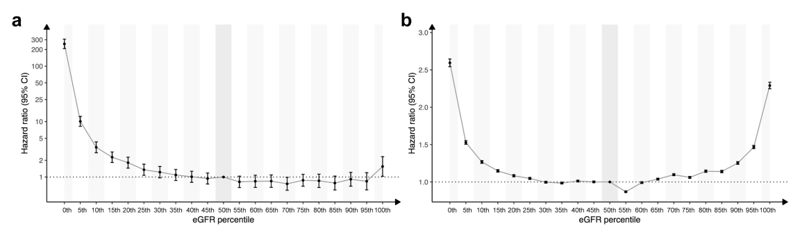 图2.eGFR百分位数与KFRT(a)和全因死亡率(b)的风险比