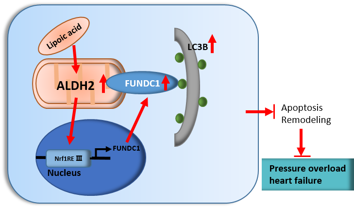 α-硫辛酸(α-LA)是一种强效抗氧化剂,具有清除自由基、螯合金属离子及再生维生素C、维生素E、谷胱甘肽等其他抗氧化剂的多种生物学活性。前期动物研究显示,α-LA可显著减轻主动脉缩窄(TAC)诱导的野生型小鼠左心室肥大、纤维化及功能障碍,但对ALDH2敲除小鼠无此保护作用,提示ALDH2是硫辛酸发挥心肌保护效应的必要介质。进一步机制研究表明,α-LA通过恢复ALDH2的活性与表达,上调线粒体自噬受体蛋白FUNDC1的水平,从而发挥心肌保护作用。FUNDC1是介导缺氧诱导线粒体自噬的关键受体分子,其表达上调可促进损伤线粒体的清除,维持线粒体质量稳态。这一分子机制涉及ALDH2-Nrf1-FUNDC1信号级联的激活,为硫辛酸的心肌保护作用提供了理论依据(图3)[13]。