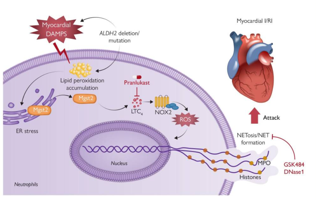 图2. ALDH2缺陷、中性粒细胞NETosis与心肌缺血再灌注损伤的机制通路