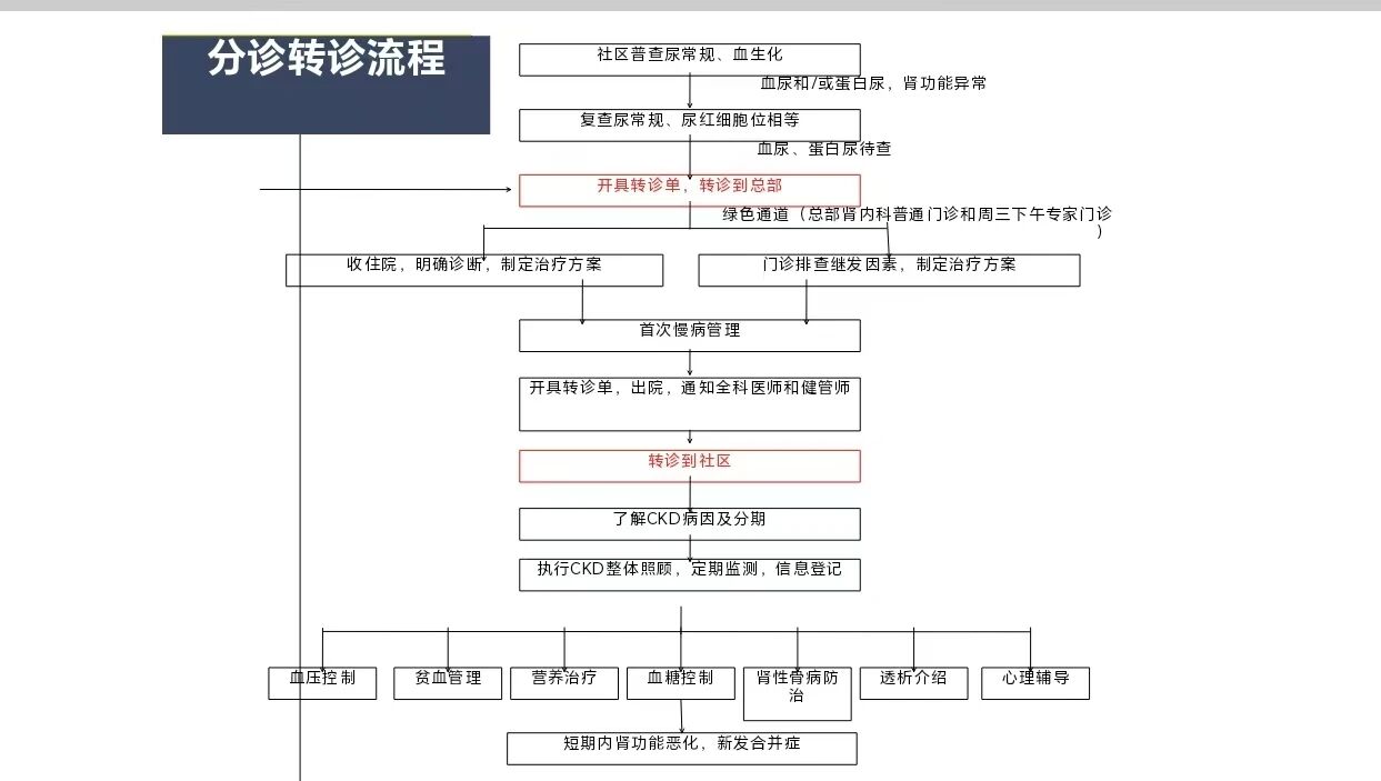 ②社区卫生服务中心:负责高血压、糖尿病、早期CKD患者的日常监测、基础干预及筛查转诊;