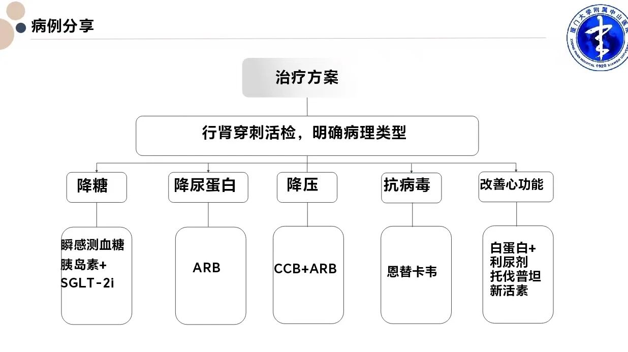 肾内科团队首先启动多学科评估,排除血液系统疾病后,通过肾穿刺活检明确诊断为: 结节性糖尿病肾小球硬化症(III级)合并乙肝病毒相关性肾炎。治疗初期采用降压、降糖、抗病毒、利尿等综合方案,同时启用新药非奈利酮联合 SGLT2 抑制剂、RASi治疗,患者蛋白尿显著下降,即便治疗期间遭遇新冠感染,疗效仍保持稳定。