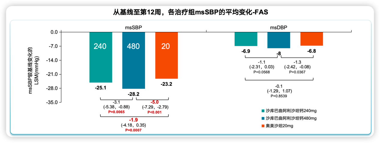 沙库巴曲阿利沙坦在我国轻中度原发性高血压患者中开展的一项大规模Ⅲ期临床研究[5]评估了其长期疗效与安全性。结果显示,该药物可有效降低轻中度高血压患者的血压,且呈现明确的量效关系,降压效果显著。治疗12周时,240 mg剂量组降低收缩压的效果非劣于奥美沙坦20 mg(组间差异-1.9 mmHg);而480 mg剂量组的降压效果则显著优于奥美沙坦(组间差异-5.0 mmHg),优效性成立。同时,480 mg剂量组的降压效果明显优于240 mg剂量组,进一步证实了其量效关系(见下图)。