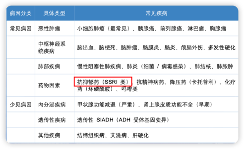 SIADH病因多样,包括恶性肿瘤、中枢神经系统疾病、肺部疾病及药物等(见下图)。本例患者无相关肿瘤及肺、脑疾病证据,但长期服用两种药物:雷贝拉唑与盐酸舍曲林,需要进一步排除药物源性可能。