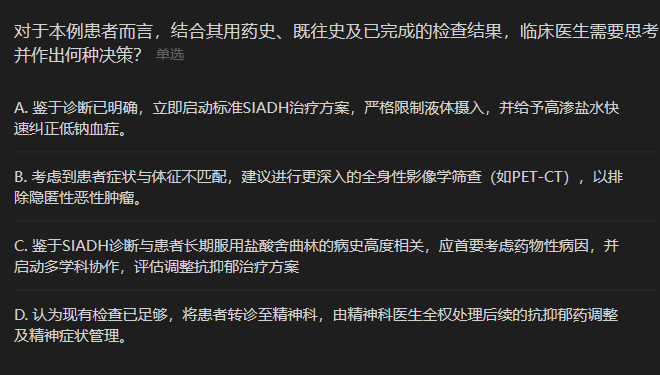 选择C:此决策是立足于现有证据与临床逻辑的最优路径,精准地践行了以患者为中心的个体化医疗理念。它精准聚焦核心线索,将明确的诊断(SIADH)与最可能的、且可干预的病因(舍曲林)直接关联;它体现了现代多学科协作的精髓,涉及精神类药物的调整,必须通过内分泌科、精神科与临床药学的紧密联动,共同评估风险与获益,在确保情绪障碍得到控制的前提下,纠正危及生命的电解质紊乱;它严格遵循了“对因治疗优先”的核心原则,对于药物诱导性SIADH,停用或更换可疑药物是根本性的首要干预措施。