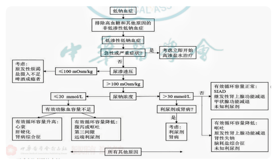 遵循低钠血症流程图(见下图),根据关键辅助检查结果确定其性质: