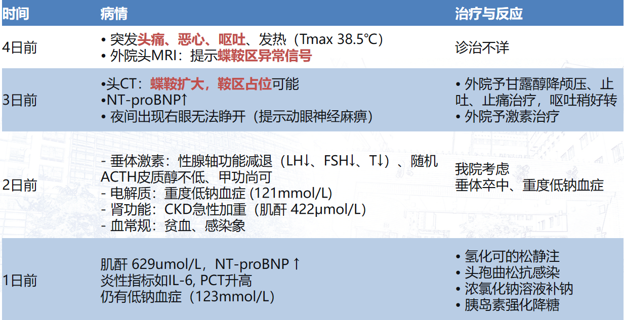 本阶段由内分泌科主导,在严密监护条件下实施精细化代谢调控:纠正低钠血症;启动胰岛素泵实现血糖控制;给予糖皮质激素以稳定循环功能、减轻垂体区域水肿。同时根据患者出入量及心功能动态实施容量管理与肾功能保护。