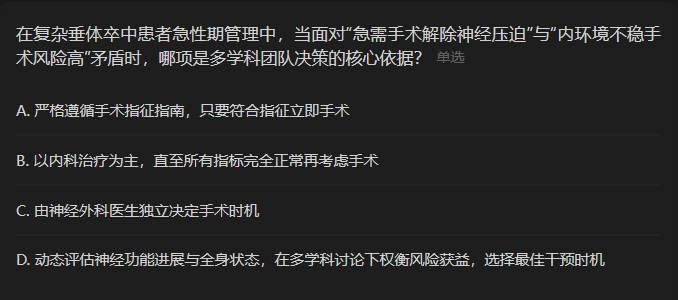 D选项体现了现代危重病管理中最核心的“个体化”与“团队决策”原则。病情复杂的患者常不存在教科书式完美的手术时机,决策需基于对神经损伤可逆性的预判、对内科调整潜力的评估,以及对整体风险的前瞻性权衡。只有通过多学科实时沟通、动态评估,才能找到那个“获益最大、风险可控”的关键决策点。A选项忽略了个体差异与合并症影响;B选项可能错失神经功能恢复的黄金时间;C选项忽视了复杂患者全身管理的重要性。