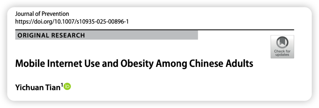 1. Tian, Yichuan. “Mobile Internet Use and Obesity Among Chinese Adults.” Journal of prevention (2022), 10.1007/s10935-025-00896-1. 9 Jan. 2026, doi:10.1007/s10935-025-00896-1