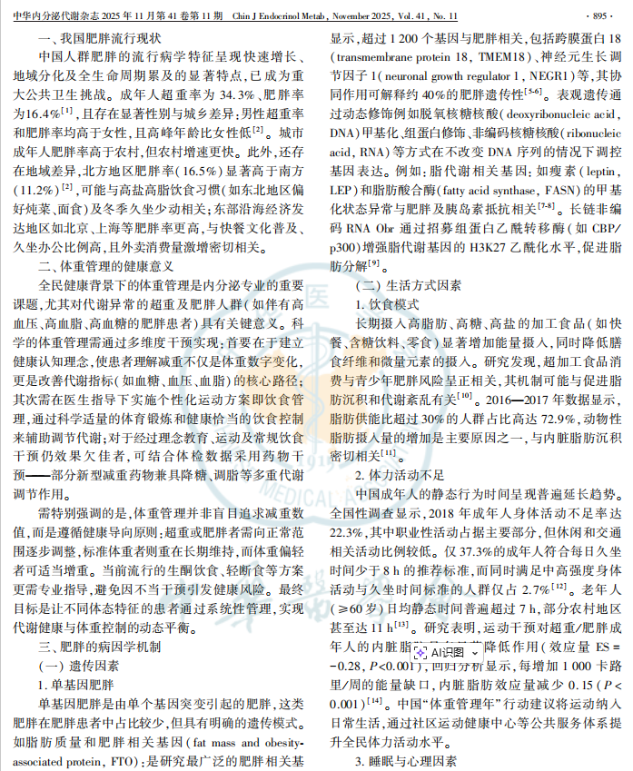 我国成人体重异常(含超重、肥胖及消瘦)已构成双向公共卫生挑战:超重及肥胖引发多种慢性并发症,而消瘦则导致营养不良、肌少症及器官功能损害风险升高。为系统应对上述问题,各地内分泌、运动、营养及精神心理多学科专家多次召开体重管理研讨会,结合最新流行病学数据与临床证据,在覆盖肥胖管理核心内容的基础上,补充消瘦相关评估与干预体系,最终制定本指南,并于2025年11月在《中华内分泌代谢杂志》正式发表。本指南重点阐述超重与肥胖的病因学机制、评价方法及多维度管理策略,涵盖诊断评估、医学营养、运动治疗、药物干预、心理支持等核心内容,旨在为临床实践提供科学规范的全人群体重管理路径,遏制肥胖率上升趋势、减轻体重异常相关合并症及改善人群营养状况与生存质量。