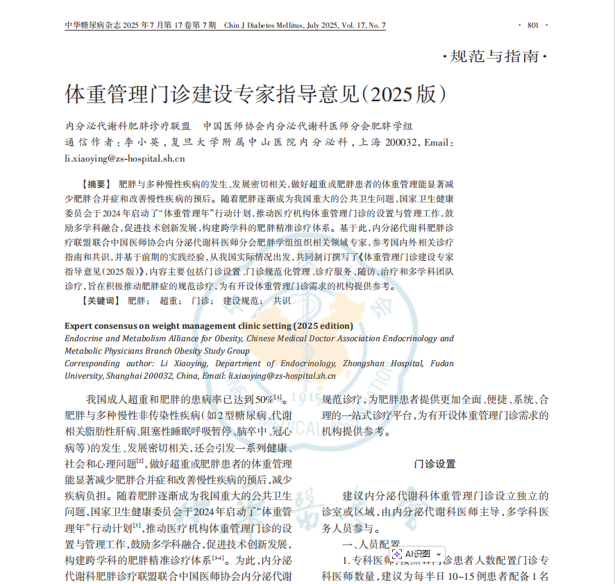 《体重管理门诊建设专家指导意见(2025版)》