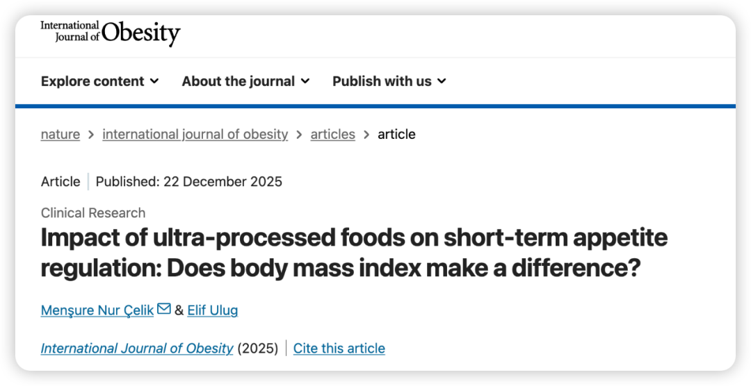 参考文献:Çelik, M. N., & Ulug, E. (2025). Impact of ultra-processed foods on short-term appetite regulation: Does body mass index make a difference? International Journal of Obesity. https://doi.org/10.1038/s41366-025-01961-9