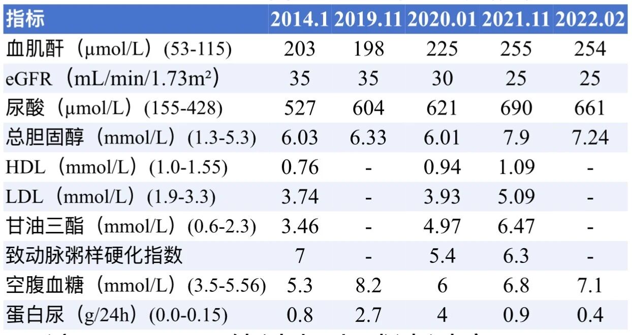 肾活检后3个半月,患者发生股浅动脉血栓,接受血栓切除术;3年半后(2017年)出现Q波心肌梗死,确诊2型糖尿病,同时伴下肢动脉闭塞性病变。实验室检查显示持续严重代谢异常:总胆固醇最高达7.90 mmol/L,甘油三酯6.47 mmol/L,尿酸690 μmol/L,空腹血糖8.2 mmol/L(表1)。尽管治疗方案不断调整(加用β受体阻滞剂、降尿酸药及双联抗血小板治疗),患者血压仍未达标,且因未坚持饮食控制及运动,CKD缓慢进展至G4期[eGFR 25 ml/(min·1.73m2)]。