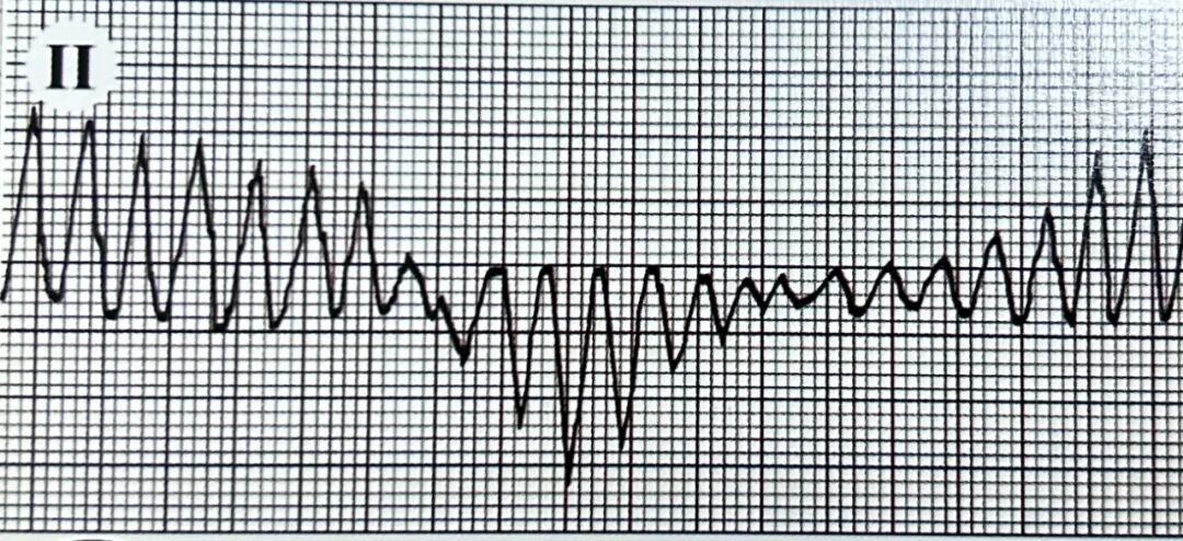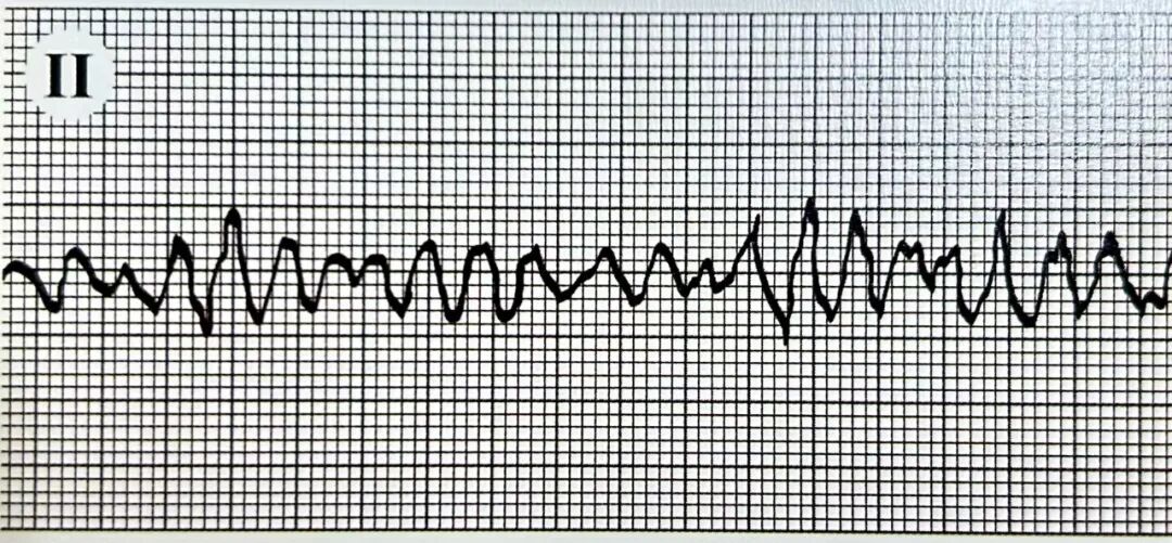 正常的P-QRS-T波群完全消失,代之以连续、规则、形态一致的宽大正弦波样波形,无法区分QRS波与ST-T段,频率极快(200-300次/分),已无法分辨QRS波、ST段和T波。其形态介于单形性室速和心室颤动之间,为心室扑动。