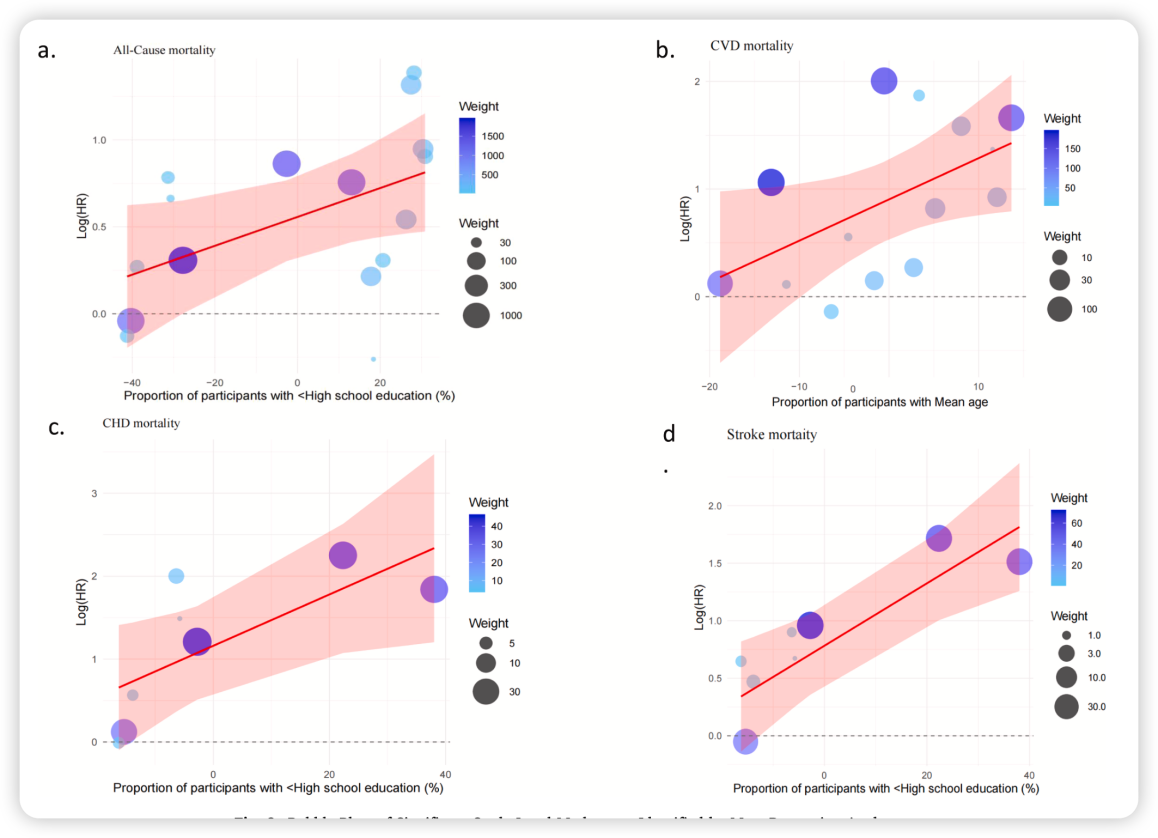 教育程度的差异显著解释了研究间观察到的异质性:分别贡献了全因死亡异质性的 25%、冠心病死亡的 55% 以及卒中死亡的 68% 。