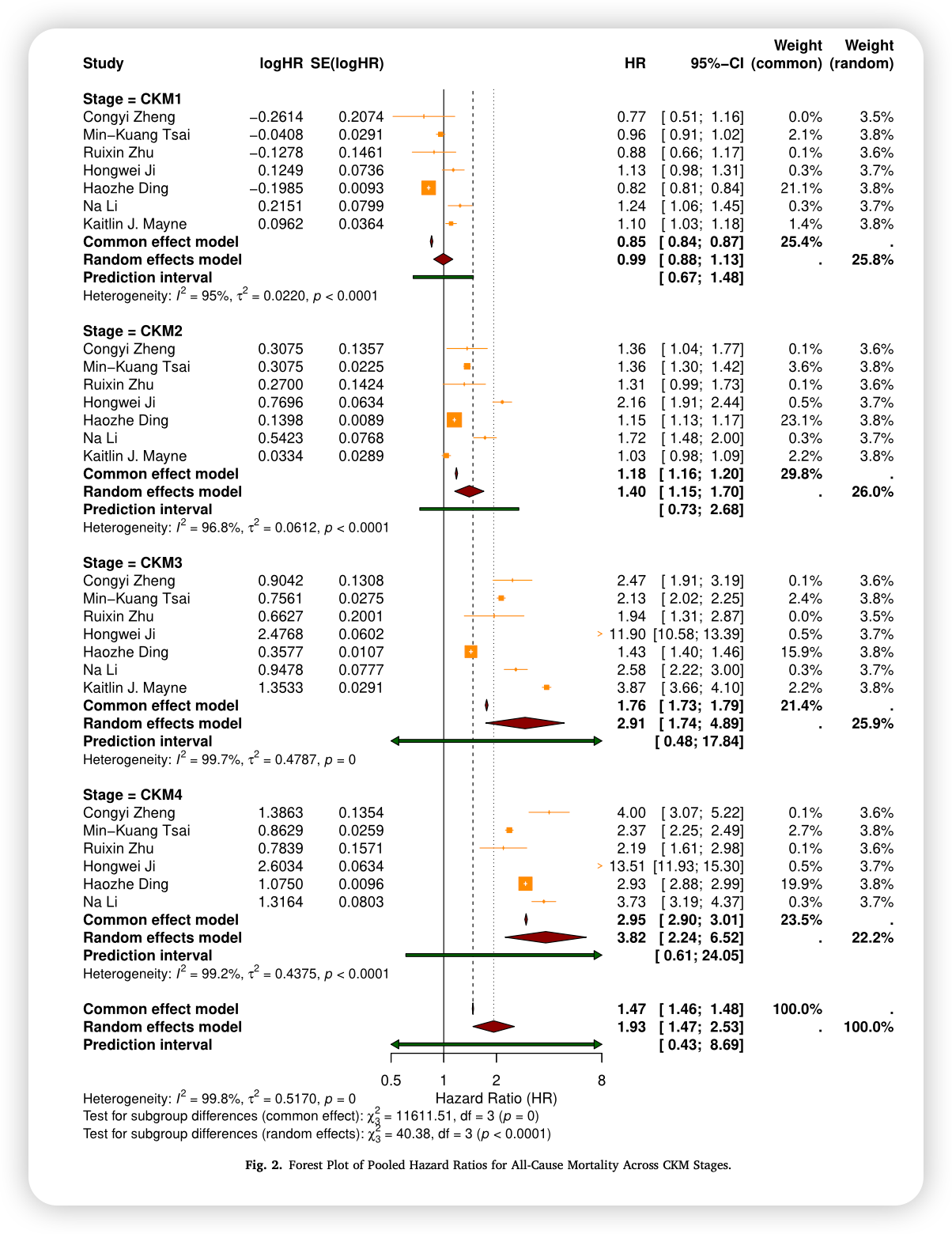 图1. 全因死亡率在不同CKM分期的合并风险比