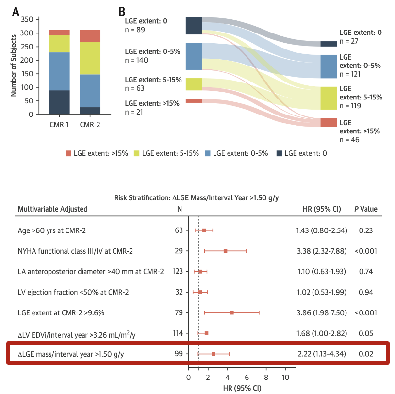 除了静态的LGE范围,LGE的动态进展速度也成为HCM预后评估的重要依据。赵世华教授团队研究发现,LGE进展速度超过每年1.5 g的HCM患者,不良心血管事件风险增加122%,这一指标可显著提高HCM风险识别的准确性,为动态随访和干预时机选择提供了量化依据。