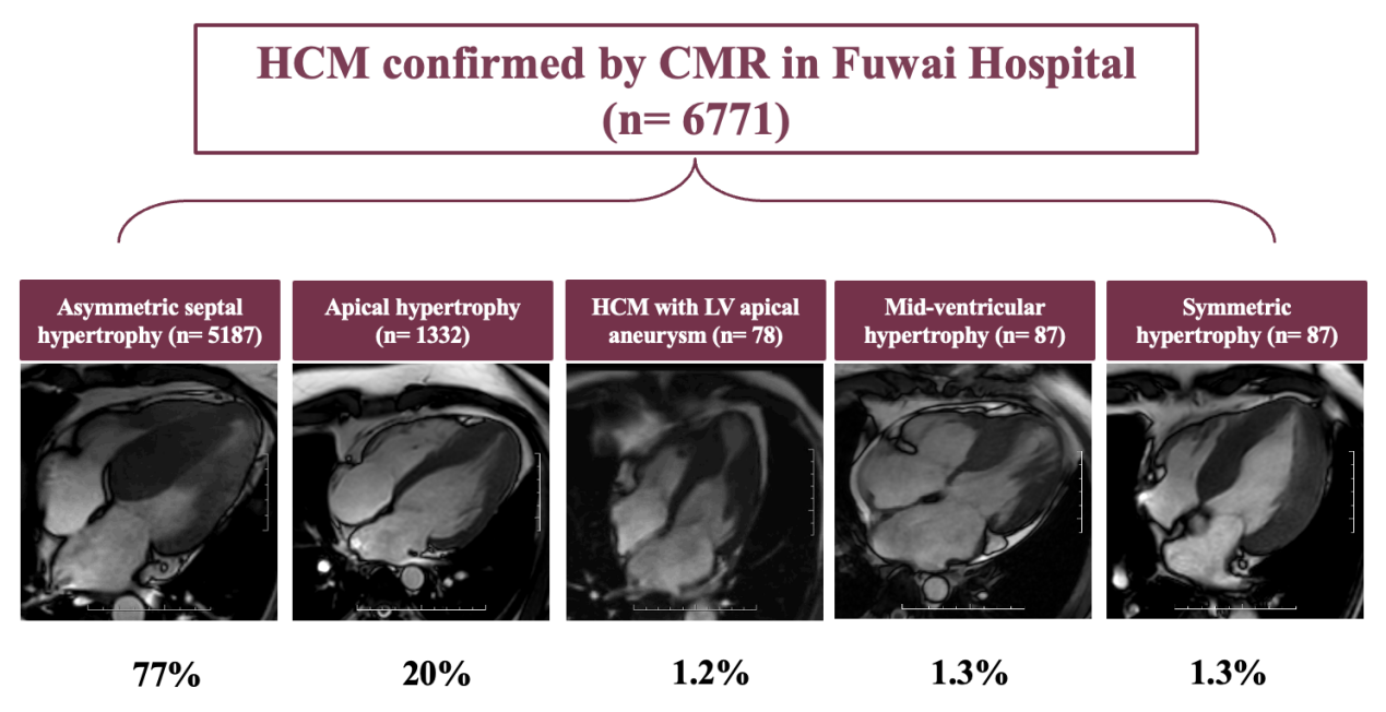 基于阜外医院2010~2018年6771例经CMR确诊的HCM患者数据,赵世华教授团队明确了中国人群HCM的核心分型特点:非对称性室间隔肥厚最常见(77%),其次为心尖肥厚(20%),中间室间隔肥厚、对称性肥厚、合并左室心尖室壁瘤的类型相对少见(各占1.2%~1.3%)。