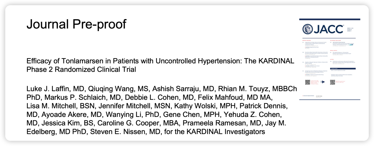 1.Laffin LJ, et al. Efficacy of tonlamarsen in patients with uncontrolled hypertension: the KARDINAL phase 2 randomized clinical trial. J Am Coll Cardiol. 2026. doi:10.1016/j.jacc.2026.03.034
