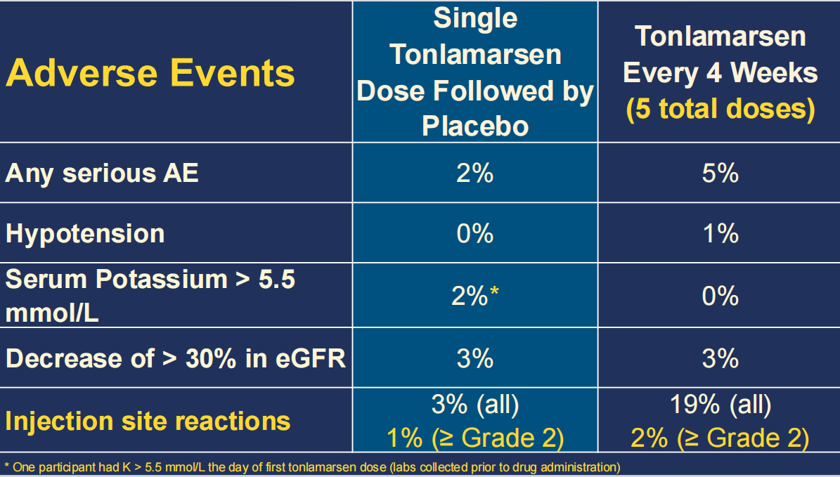 在为期5个月的治疗过程中,Tonlamarsen表现出良好的安全性,未观察到严重的电解质紊乱或与药物相关的显著不良事件(表1)。