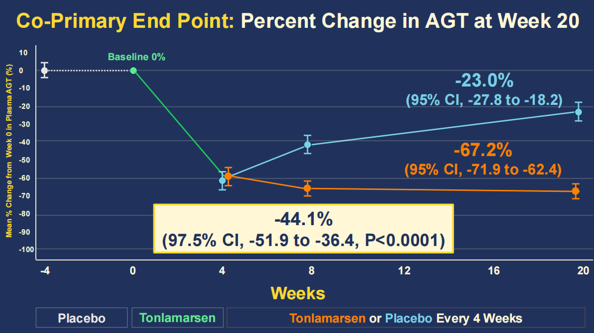 与安慰剂组相比,Tonlamarsen治疗组的血浆AGT水平显著降低了67.2%(图2)。
