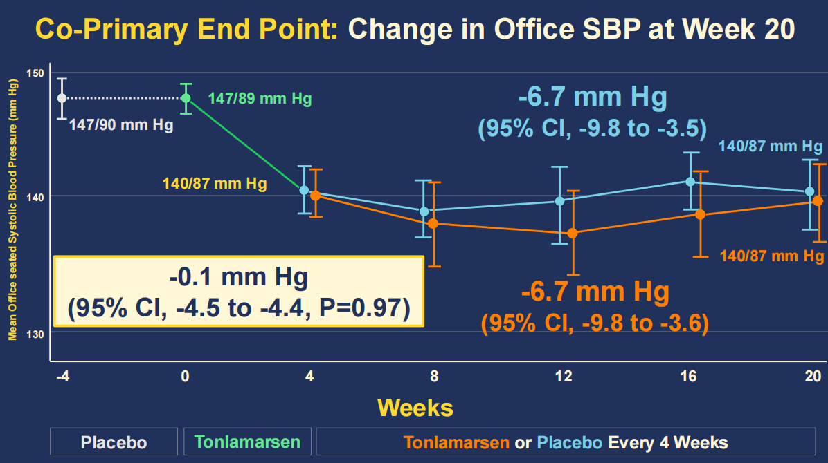 图3. Tonlamarsen 治疗组与安慰剂组的诊室收缩压(SBP)变化
