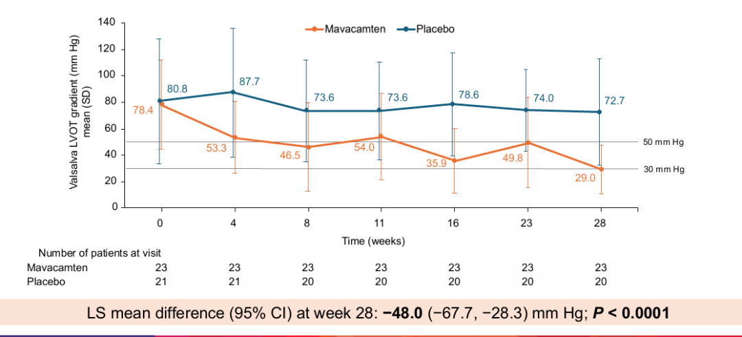研究结果显示,Mavacamten组在第28周时,Valsalva LVOT压差从基线的78.4 mmHg大幅降至29.0 mmHg(最小二乘均值变化为-48.5 mmHg),而安慰剂组仅从80.8 mmHg降至72.7 mmHg(变化为-0.5 mmHg),两组间差异达到-48.0 mmHg(图2)。这意味着Mavacamten成功将患者的激发压差降至了指南定义的梗阻阈值(30 mmHg)以下。