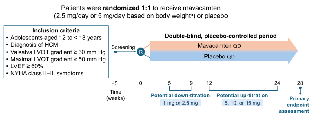 Mavacamten是一种选择性、心肌特异性的肌球蛋白抑制剂,此前已在全球60多个国家获批用于治疗有症状、纽约心脏病协会(NYHA)心功能Ⅱ级或Ⅲ级的成人oHCM患者(基于EXPLORER-HCM研究等)。然而,其在青少年群体中的疗效和安全性一直未知。在此背景下,SCOUT-HCM 3期临床试验应运而生,旨在评估Mavacamten在青少年oHCM患者中的疗效与安全性。