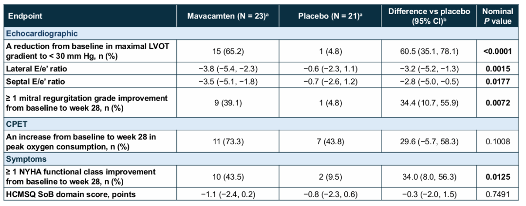 临床症状方面,Mavacamten组有43.5%的患者NYHA心功能分级改善≥1级,而安慰剂组仅为9.5%(P=0.0125)。此外,Mavacamten组有39.1%的患者二尖瓣反流改善≥1个等级。