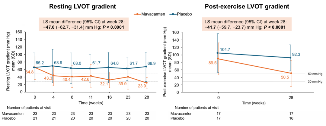 除了激发压差,Mavacamten组较安慰剂组显著降低静息LVOT压差,组间差异为-47.0 mmHg;显著降低运动后LVOT压差,组间差异达到-41.7 mmHg(图3)。