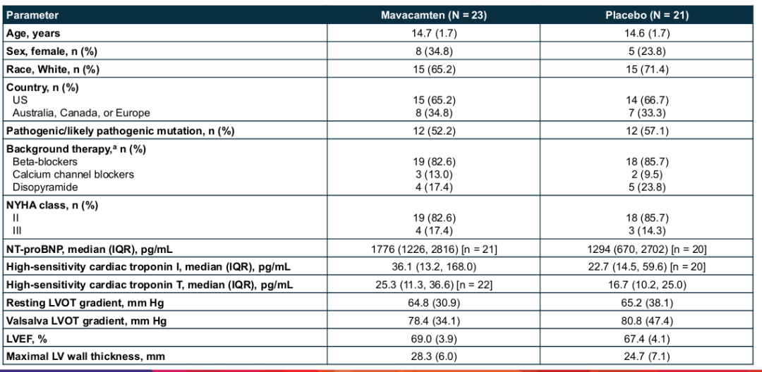 基线数据显示,两组患者特征基本均衡(表1)。患者平均年龄约为14.6岁,超过80%的患者正在使用β受体阻滞剂。值得注意的是,与成人EXPLORER-HCM研究相比,本研究中的青少年患者基线LVOT压差更高、心室壁更厚、心脏生物标志物水平更高,提示这是一个疾病表型更为严重的患者群体。