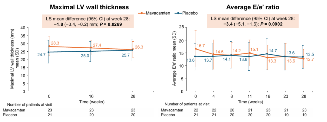 心脏结构与舒张功能方面,Mavacamten组最大左室壁厚度显著减少,组间差异为-1.8 mm;平均E/e'比值显著改善,组间差异为-3.4,提示心肌肥厚和舒张功能障碍得到逆转(图4)。