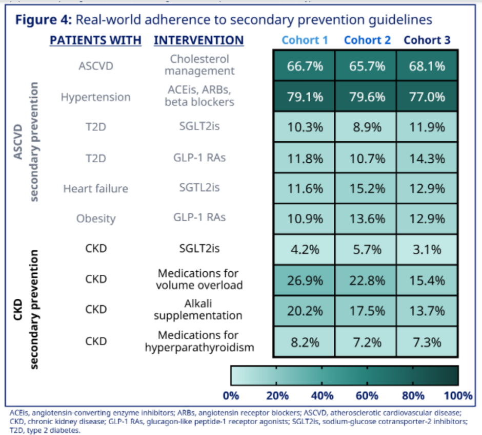尽管SGLT2抑制剂(SGLT-2i)和GLP-1受体激动剂(GLP-1 RA)在多项研究中已被证实能显著降低心肾终点事件,但在真实世界中的渗透率极低。数据显示,在合并心衰或肥胖的ASCVD患者中,这些药物的使用率仅维持在11%~15%之间;而在针对延缓CKD进展的二级预防中,SGLT2i的使用率甚至不足6%(见图3)。这表明,新药从循证医学证据转化为临床常规处方的过程仍存在显著滞后。