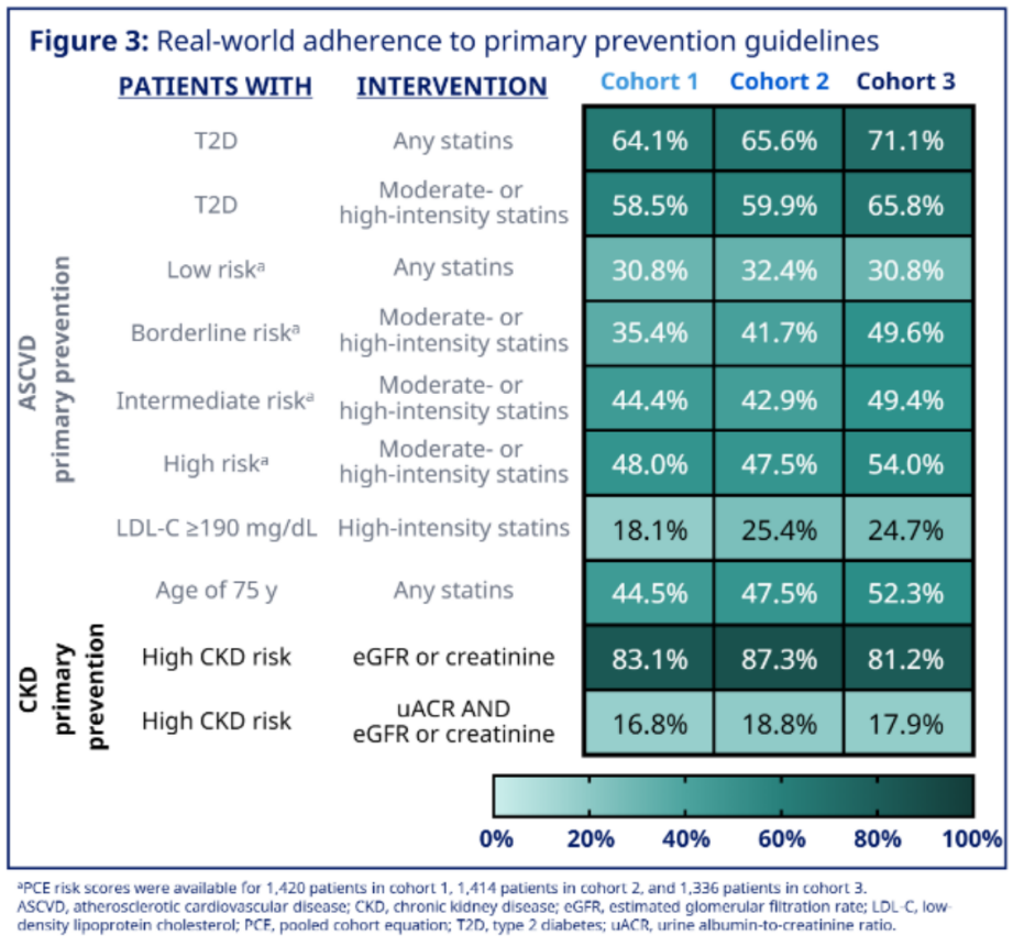 在确证前12个月,指南推荐的ASCVD与CKD一级预防方案在临床上的实践率并不理想(表1)。在ASCVD一级预防方面,研究数据显示,在合并2型糖尿病患者中,任何他汀类药物的使用率为64%~71%;而在非糖尿病且具有心血管风险的人群中,符合指南推荐强度的他汀使用率仅为31%~54%(图2)。这客观反映出真实世界中针对不同风险人群的一级预防干预力度尚未完全达到指南的预期目标。
