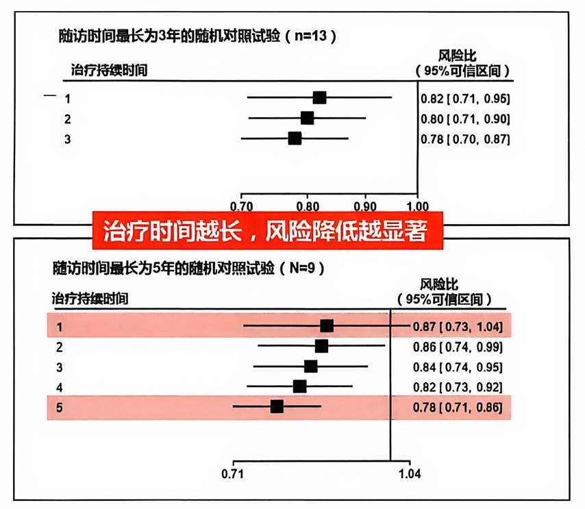 图1. 不同随访时长下,LDL-C降低1 mmol/L对MCE风险的影响
