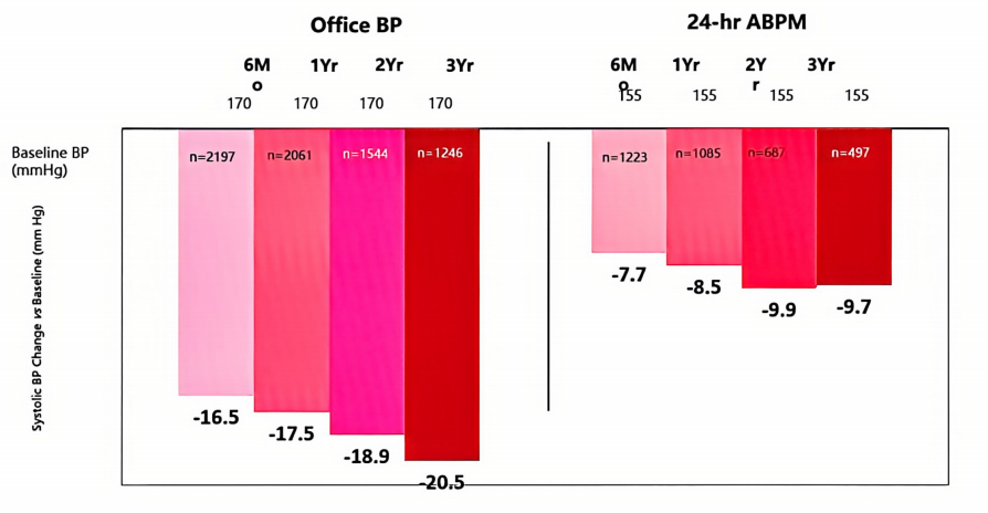 多项RDN核心研究的3年随访数据一致显示,术后诊室收缩压的下降幅度并非随时间衰减,反而呈现持续增强的趋势(图1),例如: