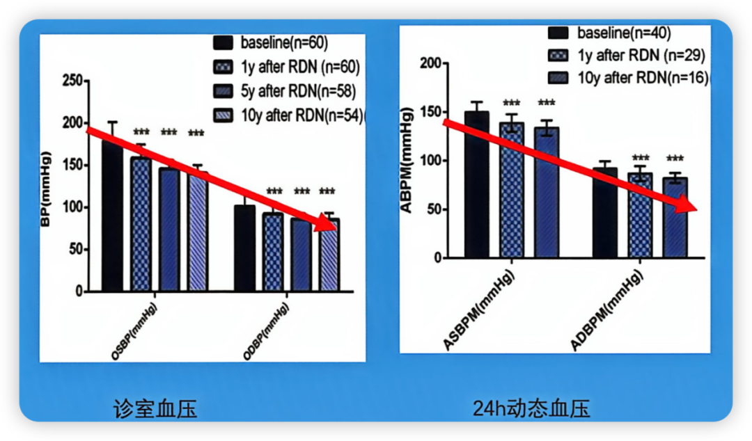 以上循证医学证据表明,RDN疗法并非“昙花一现”的短期干预,其降压效果在术后8至10年内依然表现强劲且平稳。