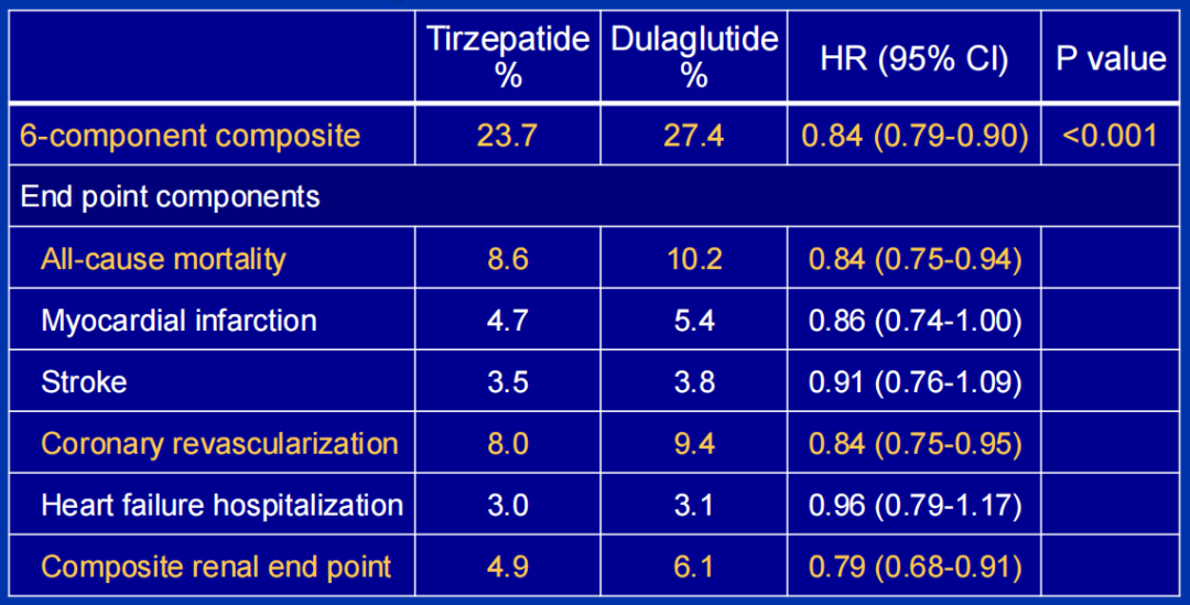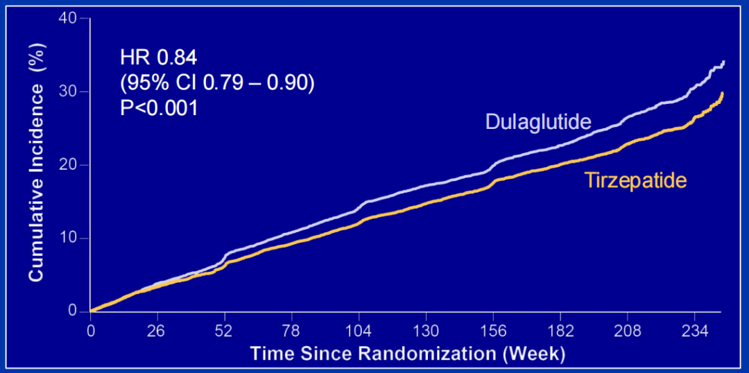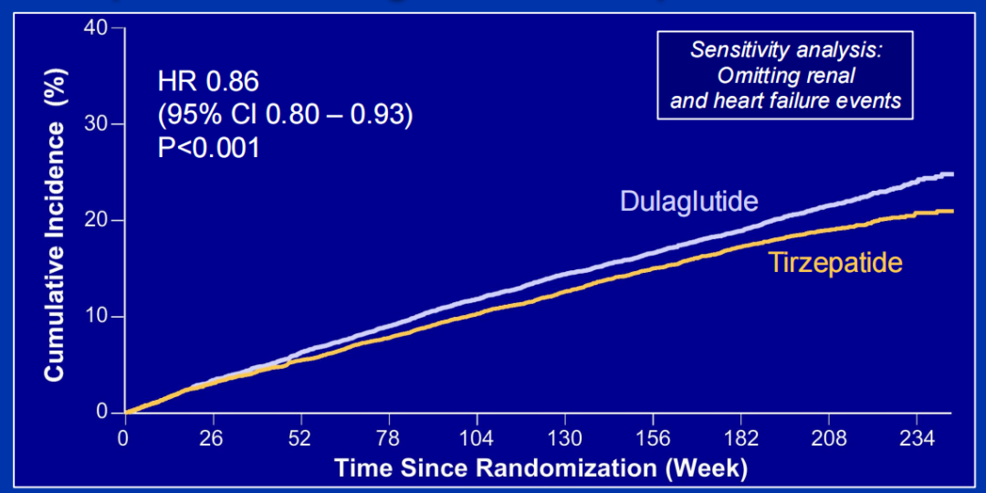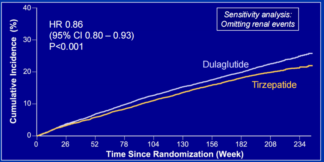 中位46.9个月治疗期间,替尔泊肽组6点心肾不良事件复合终点发生率为23.7%(1559例),度拉糖肽组为27.4%(1803例)。与度拉糖肽相比,替尔泊肽使该终点风险降低16%(HR 0.84,95%CI:0.79~0.90,P<0.001),绝对风险降低3.7%,提示每治疗27例患者可预防1例事件(NNT=27)。