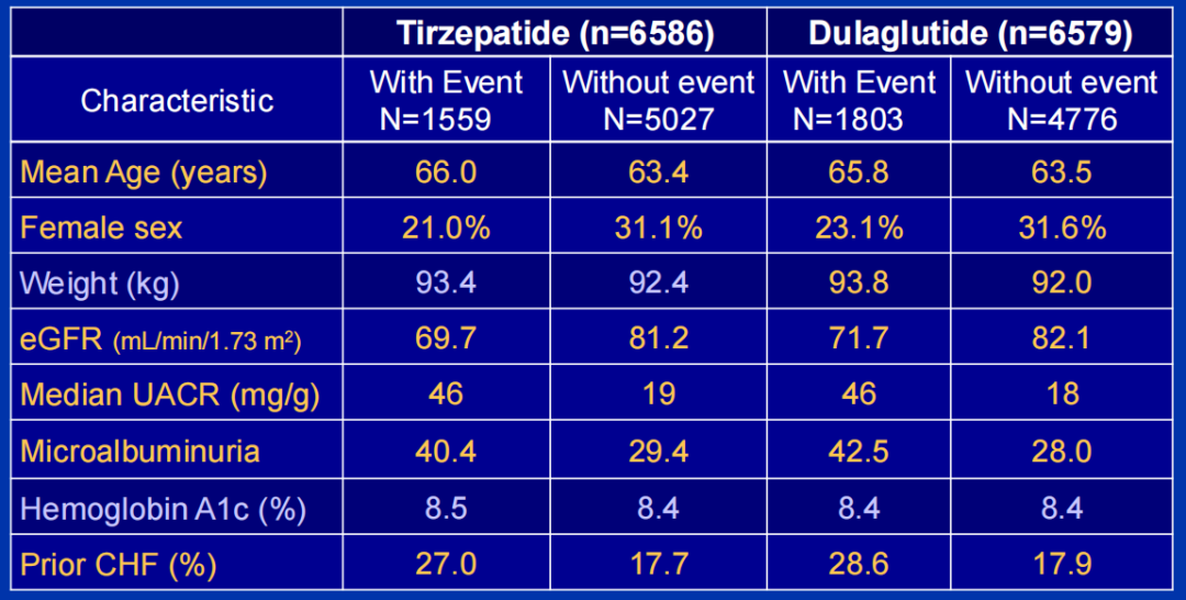基线时患者平均年龄64岁,男性9348例(71.0%),女性3817例(29.0%),平均HbA1c为8.4%。表1列出两组中出现/未出现心肾复合终点事件患者的基线特征。