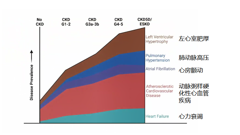 病理生理机制上,慢性肾病可引起全身性、慢性的促炎状态,促进血管和心肌的重塑过程,导致动脉粥样硬化病变、血管钙化、血管衰老,以及心肌纤维化和心脏瓣膜钙化。从这个角度看,慢性肾病相当于加速了心血管系统的衰老。研究显示,随着慢性肾病的分期增加,患者心血管疾病(如:左心室肥厚、肺动脉高压、心房颤动、动脉粥样硬化性心血管疾病、心力衰竭)的发生风险不断提升。