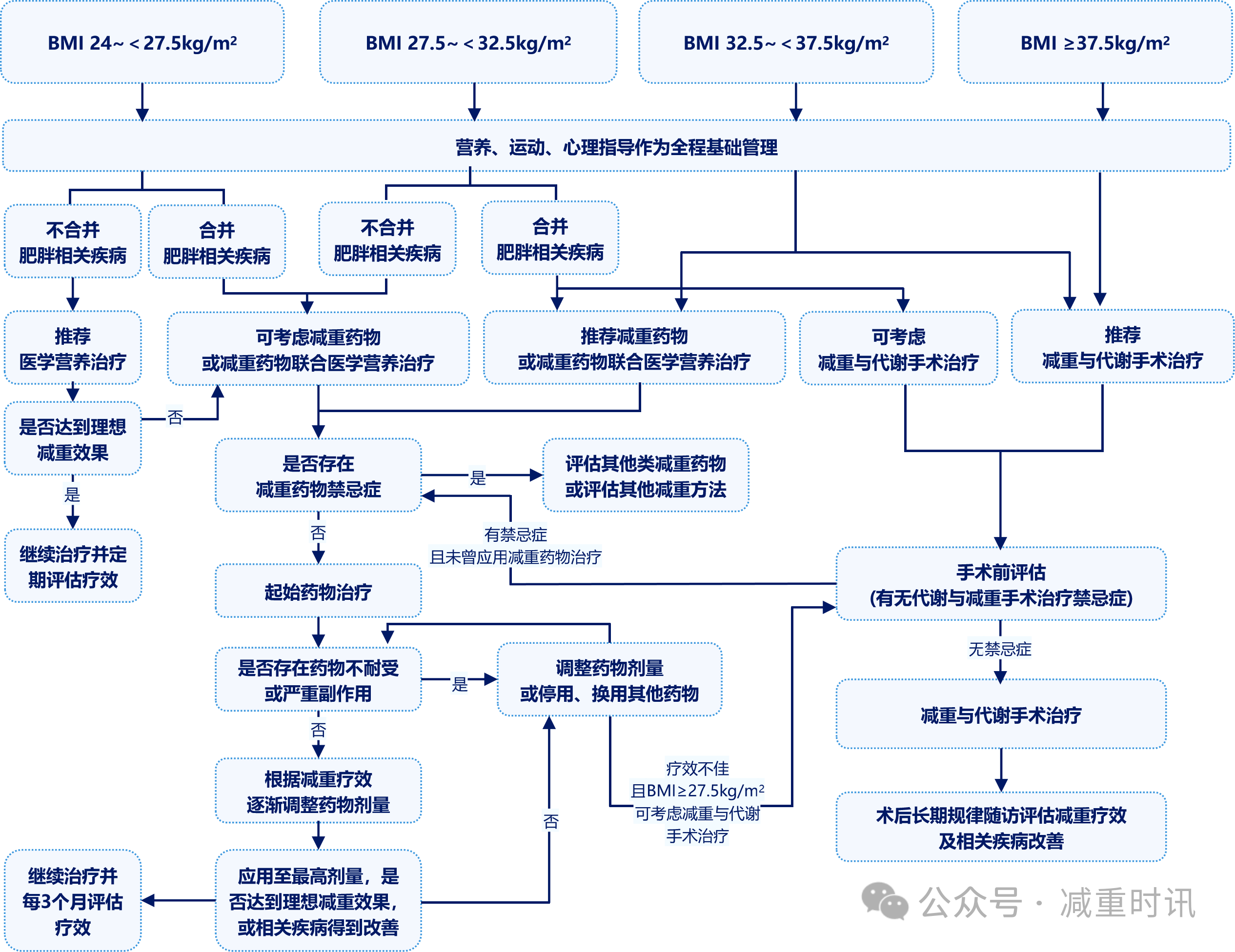 在这个过程中,我们特别强调诊疗方案的同质化与规范性。所有诊疗决策都严格遵循国家卫生健康委员会发布的《肥胖症诊疗指南(2024版)》推荐的临床路径(图1)[2]。通过定期的集体学习与病例讨论,团队内部就疾病认知与治疗策略达成高度共识,从而为每位患者提供规范且有效的治疗方案。